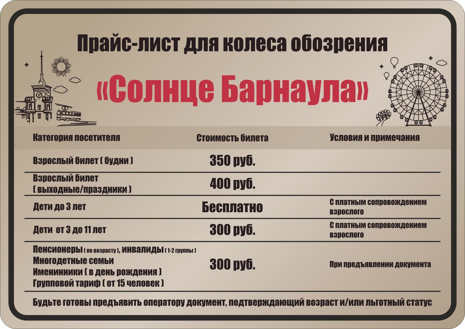 При посадке на аттракцион будьте готовы предъявить оператору документ, подтверждающий возраст и/или льготный статус.