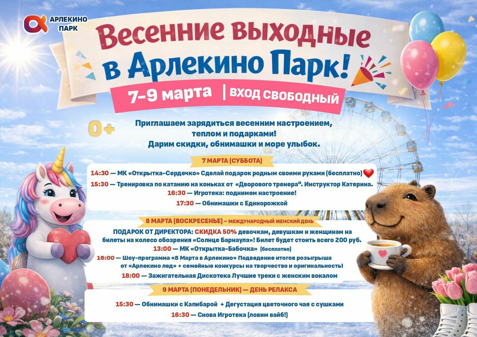 16:00 Развлекательная программа «8 Марта в Арлекино» с подведением итогов розыгрыша от «Арлекино лед». В программе семейные и командные конкурсы на творческую жилку и оригинальность.